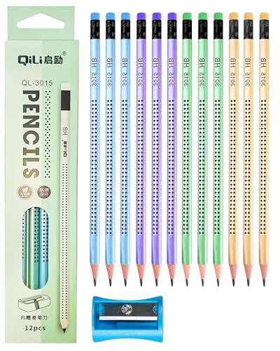 12 stycken HB blyertspennor, set med träpennor, med suddgummi och pennvässare, blyertspennor barn halkfri, blyertspenna trekant flerfärgad, grafitpenna för tester, skola, kontor, ritning och skiss