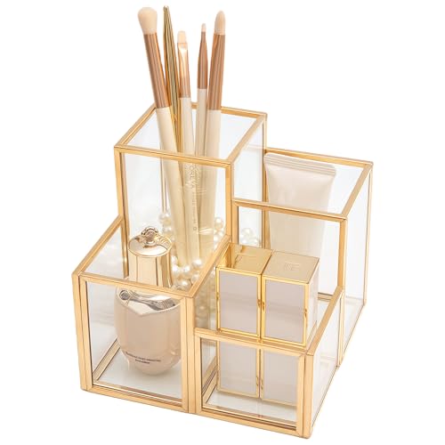 HARLIANGXY Sminkborste organisatör guld, penselhållare kosmetika 4 fack – kosmetisk arrangör glas, kosmetisk arrangör transparent, sminkförvaring för kosmetisk pensel eyeliner mascara