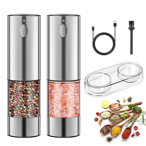 Salt och pepparkvarn elektrisk uppsättning av 2, USB uppladdningsbar elektrisk kryddkvarn i rostfritt stål med keramisk kvarn, LED-belysning, justerbar skärpa