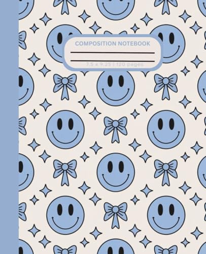 Cute Preppy Aesthetic Composition Notebook with Pastel Blue Coquette Bows and Smiley Faces: Wide Ruled Journal for Girls, Kids, Teens; Perfect Gift for Girl | 110 Pages, Lined Paper, 7.5 X 9.25