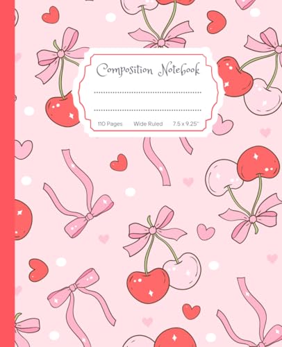 Super Cute Girly Pastel Pink & Red Bows, Hearts and Cherries, Cherry Coquette Composition Notebook: Wide Ruled Aesthetic Cool Design; Preppy Lover ... for Girls, Kids, Teens; Perfect Gift for Girl