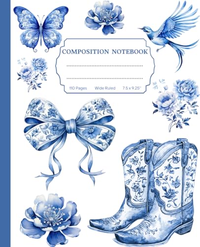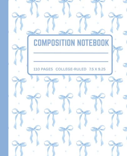 Cute Preppy Aesthetic Composition Notebook with Blue & White Pastel Coquette Bows: Wide Ruled Journal for Girls, Kids, Teens; Perfect Gift for Girl | 110 Pages, Lined Paper, 7.5 X 9.25"