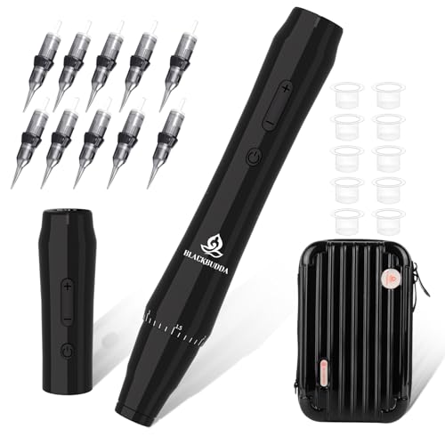 Blackbudda Tattoo Machine, Rotary Permanent Makeup Machine kit Equipped 10pcs Needles Cartridge, Ink Cups & Spare Battey (Black)