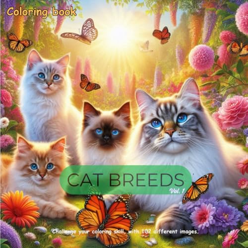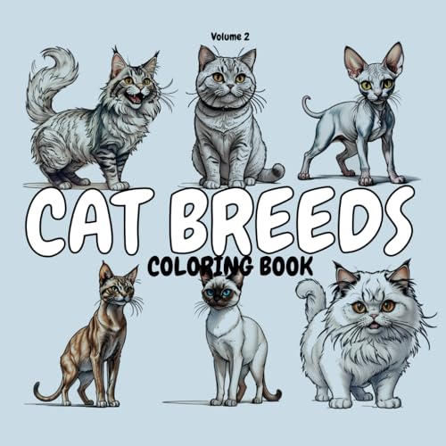 CAT BREEDS: Animals coloring book with cute cats for adults, teens, kids, boys and girls featuring breeds like siamese, sphynx, persian, ragdoll, burmilla, himalayan and many others