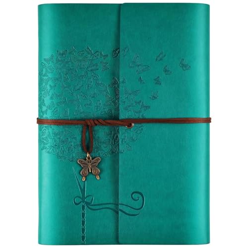 OMEYA Läderjournal anteckningsbok, resedagböcker för kvinnor, påfyllningsbar fjäril anteckningsbok fodrad personlig dagbok skrift anteckningsbok gåvor A5 16,5 x 23,4 cm (blå)