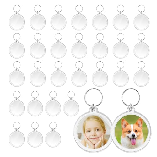 RAFIYU 30 stycken nyckelringar för foton, nyckelkedja i akryl, anpassningsbar rund nyckelring, transparent personlig nyckelring, tomt fotoram för familj, par, gör-det-själv-souvenirgåvor