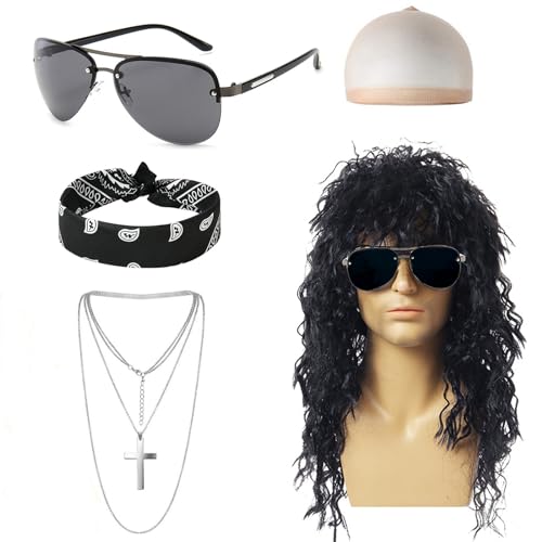 MIVAIUN 4-delad 70-tal 80-tal rock peruk kostym disco tillbehör för herr dam rockstjärna hippie punk mullet peruk bandana fred halsband solglasögon för halloween karneval (svart)