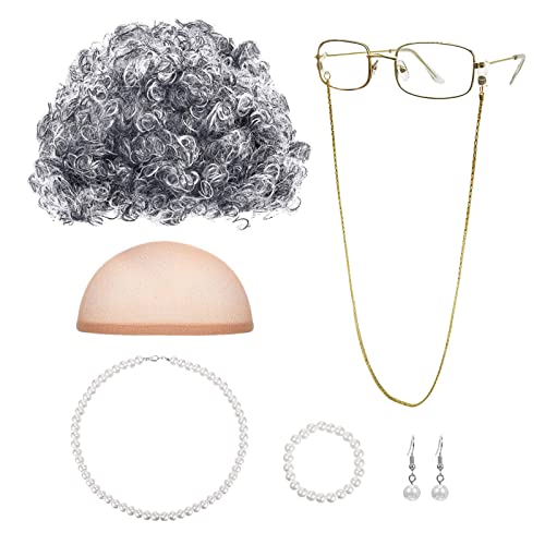MIVAIUN 7 st utklädnad gammal kvinna peruk hatt mormor glasögonkedjor falska pärlsträngar för fest 1920-talsdräkt, en storlek