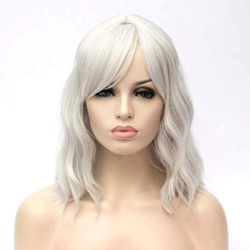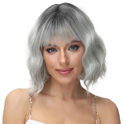 ATAYOU® Dam Kort vågig Silver Grå Full Bangs Mjuk Bob Peruk