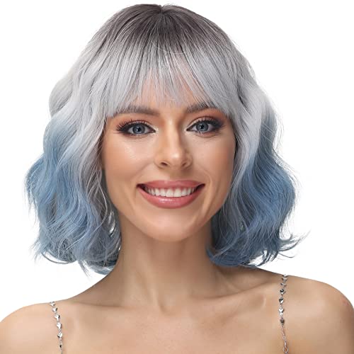 PARXITN kort bob peruk med lugg naturligt silver till blå peruk syntetiskt hår färgglatt daglig fest halloween cosplay vågiga lockiga peruker för kvinnor