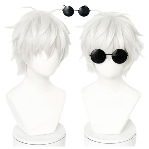 Anime Jujutsu Kaisen Satoru Gojo Cosplay Peruker, Silver Vit Kort Hår Peruker, För Halloween Party Kostym + Glasögon Peruk Cap