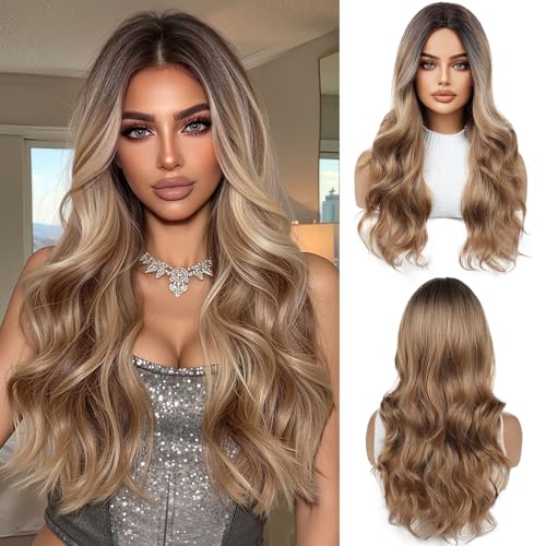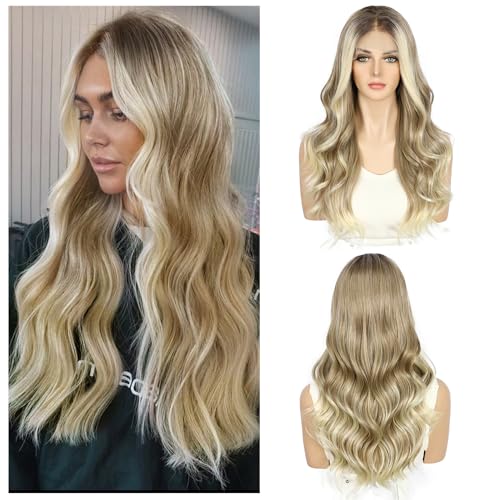 Esmee 24" Blond peruk Syntetiska peruker för kvinnor Mörka rötter lång peruk Brun Ombre Blond vågigt hår Realistisk simulering hårbotten mitten del för daglig fest användning