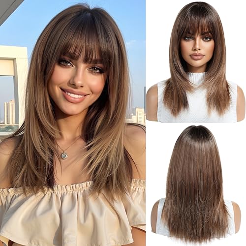 OUFEI Ombre bruna peruker för kvinnor medellång lång rak peruk med lugg syntetiskt hår värmetåliga peruker för varje dag fest cosplay användning