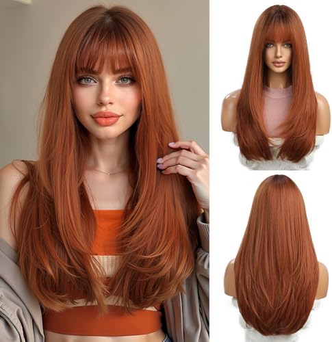 Esmee Långa raka kopparperuker för kvinnor Naturligt syntetiskt hår Ombre peruker med fransar för daglig festanvändning