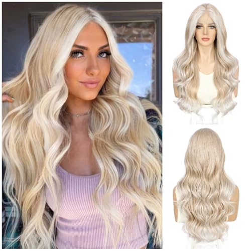 PORSMEER Blond ombre långa vågiga peruker för kvinnor mittavskiljande lockigt naturligt hår peruk värmebeständig fibersyntetisk hårersättning peruker för cosplay daglig fest daglig användning 26 tum