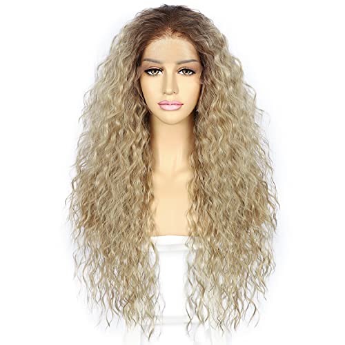 VEBONNY Peruker för kvinnor med spets framsida, brun ombre till blond peruk, syntetiskt hår, lösa lockar, ljusblond peruk, 51 cm (20 tum) VEBONNY-083