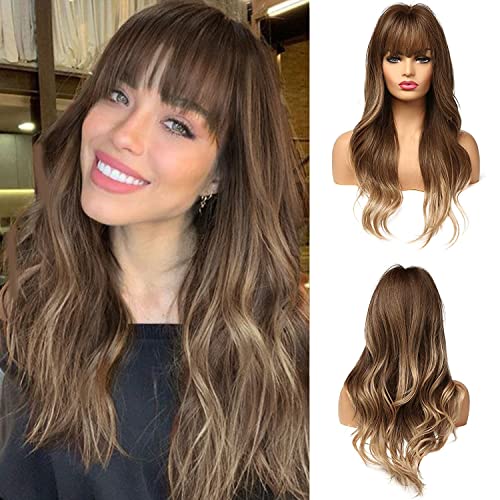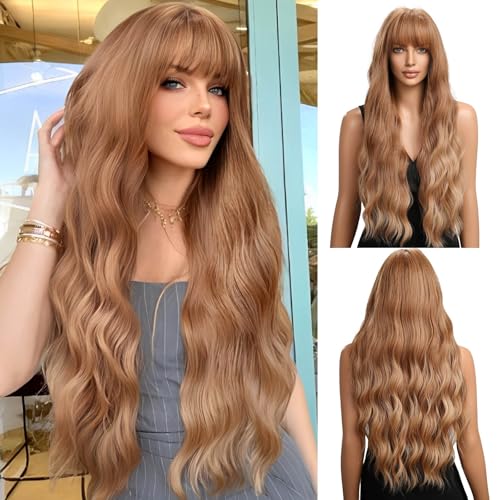 Esmee 24 Tums Lång Honey Brown Ombre Peruk med Pannor för Kvinnor Syntetiska Peruker Natural Wave Heat Resistant Hair Peruker för Daglig Fest Cosplay Användning
