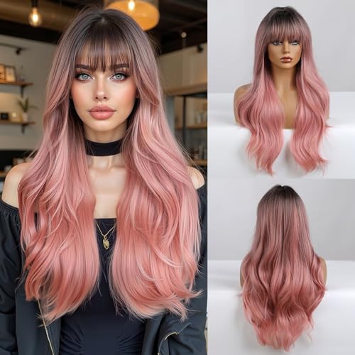 Esmee 24 tum Kvinnor syntetiska peruker Naturlig lång vågig Ombre Rosa med mörka rötter&Fluffy Air Bangs Light Cosplay Party Peruker