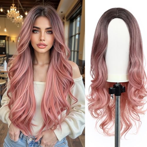 PORSMEER rosa ombre Långa vågiga peruker för kvinnor mittavskiljande lockigt naturligt hår peruk värmebeständig fibersyntetisk hårersättning peruker för cosplay daglig fest daglig användning 26 tum