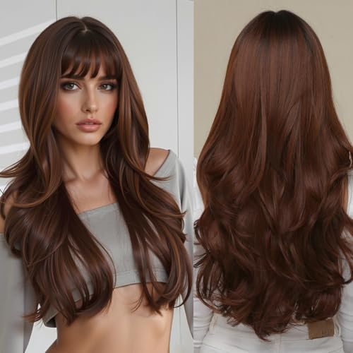 Allbell Ombre brun vinröd peruk med lugg lång lockig peruk för kvinnor värmebeständiga syntetiska peruker med lugg naturligt utseende lång vågig brun peruk för cosplay fest daglig användning 60 cm