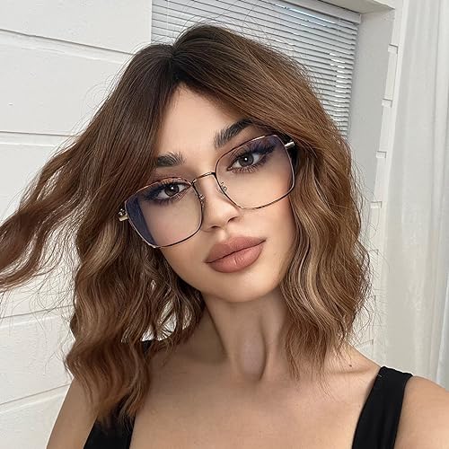 WOKESTAR Bob Lockig Peruk med Frans, Kort Syntetiska Vågiga Peruker för Kvinnor Ombre Brun Färg