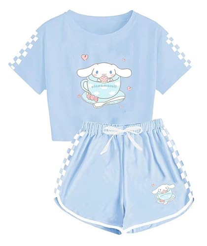 WANHONGYUE Cinnamoroll magtröja t-shirt och shorts set kvinnor flickor 2 delar kortärmad kläder sommar aktiv träningsoveraller, Ljusblått, XXS Petite