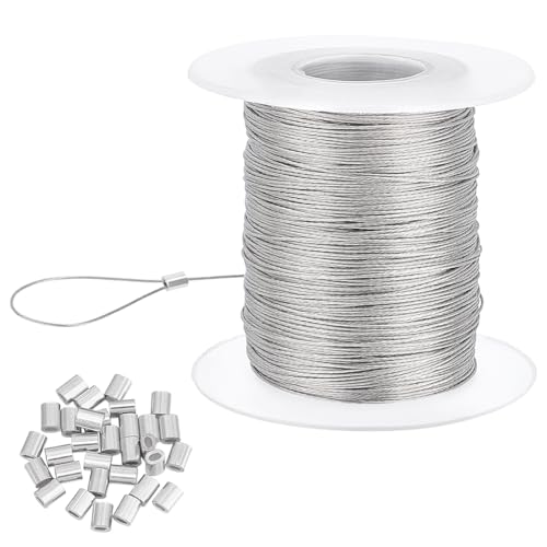 PH PandaHall Ca 100 m 0,5 mm rostfritt ståltråd, upphängningstråd med 30 st aluminiumkrimpärmar för fotoram, hängande speglar, väggdekorationer, hängande krukmaking, taklampa