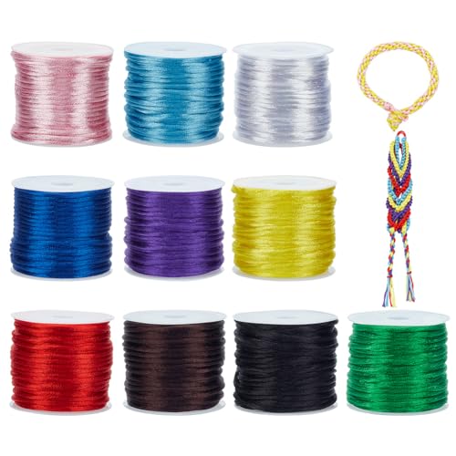 PandaHall 10 färger 2 mm satin rotting snöre nylon trim silke sladd för vänskapsarmband, kinesisk knut, makramé, trimning, smyckestillverkning, cirka 91 meter totalt