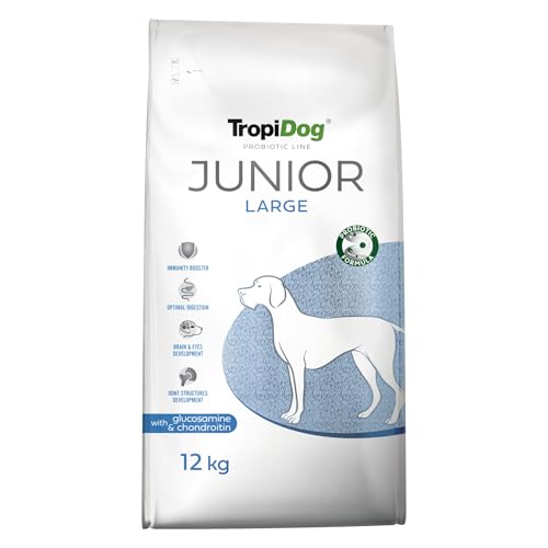 Torrfoder för stora raser (2-15 månader) med probiotika, glukosamin, kondroitin och omega-3 för leder, immunförsvar och matsmältning - TropiDog Probiotic Line Junior Large 12kg