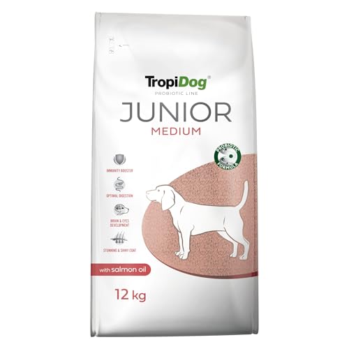 Torrfoder för medelstora raser (2-12 månader) med probiotika, laxolja och omega-3 för immunförsvar, matsmältning och hjärnans utveckling - TropiDog Probiotic Line Junior Medium 12kg