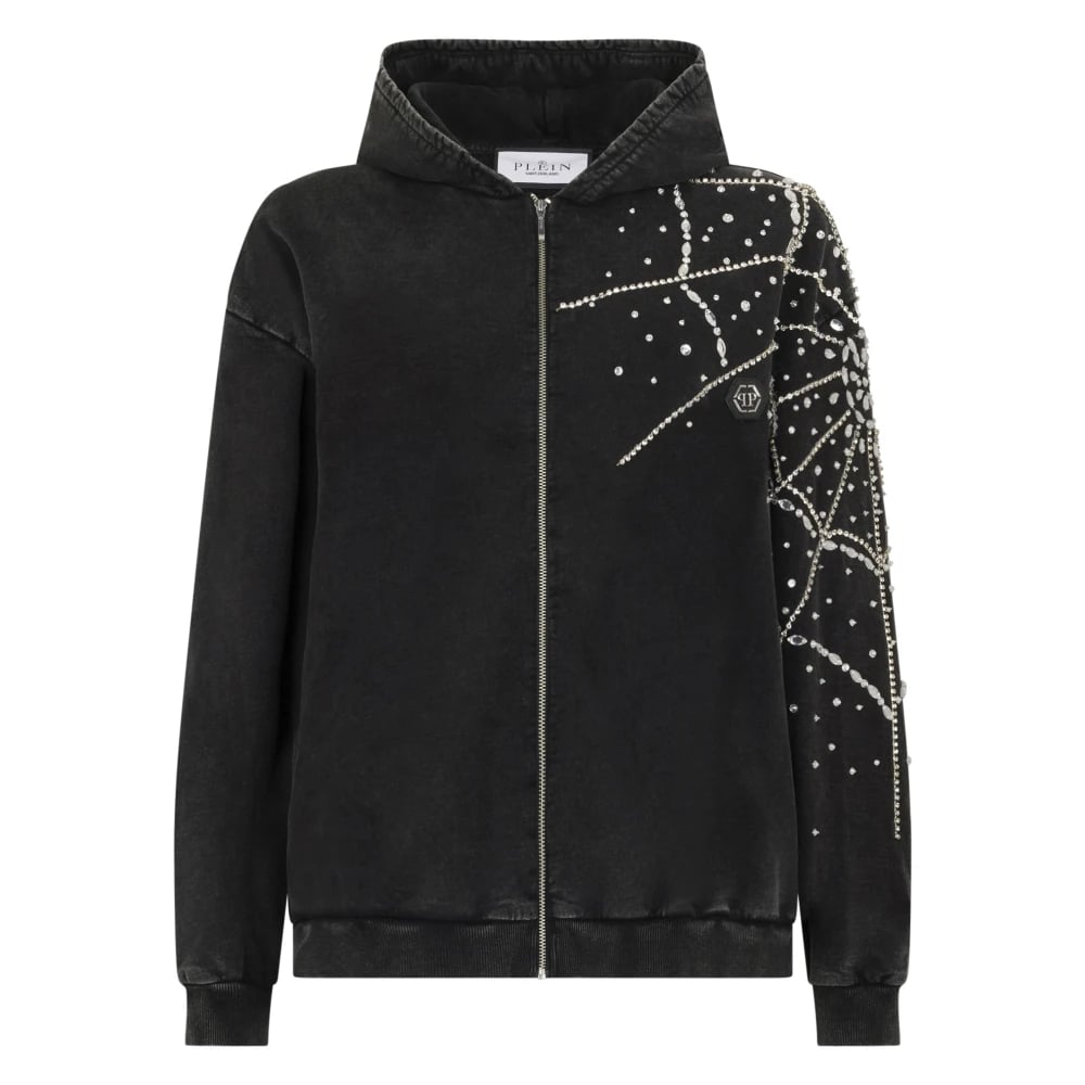 Philipp Plein, Sweatshirts & Hoodies , Dam, M, Bomull, Washed Zip Hoodie Spiderweb Strass