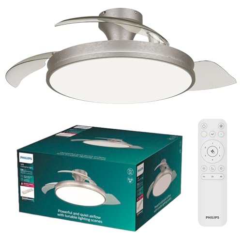 Philips Atlas Taklampa med Fläkt, Fällbara Blad och LED-lampa, 3 Blad, 106 cm i Bladdiameter, 4 500 Lumen, Reglerbart Vitt Ljus från 3 000 K till 6 500 K, Dimbar till 5%, Fjärrkontroll Ingår, Nickel
