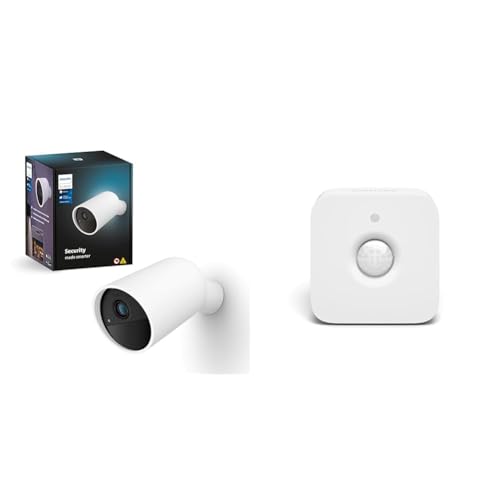Philips Hue Secure kabelgebundene Smart Home Überwachungskamera mit Standfuß, Full HD Video, Smart Home Security und Lichtsteuerung per App, weiß + Hue Bewegungsmelder Indoor, Tageslichtsensor, weiß