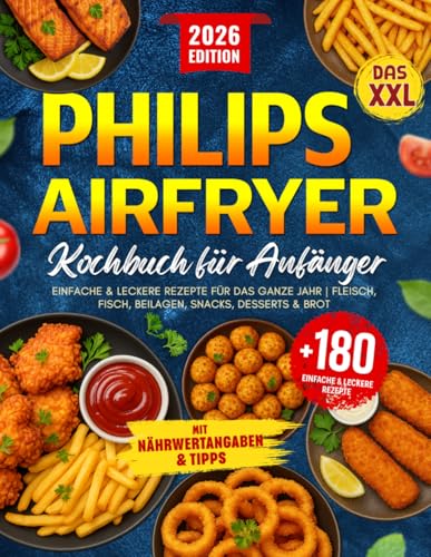 Das XXL Philips Airfryer Kochbuch für Anfänger: +180 Einfache & Leckere Rezepte für das Ganze Jahr | Fleisch, Fisch, Beilagen, Snacks, Desserts & Brot ... Tipps (Philips Heißluftfritteuse Rezeptbuch)