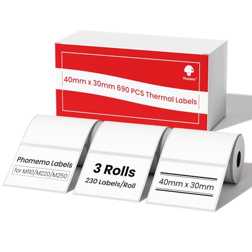 Phomemo Etikettpapper för etikettskrivarna M220 M250 M120 M110 M221, multifunktionell självhäftande etikett för streckkod, namn, pris, adress med mera, 40x30mm, 230 etiketter/rulle, 3 rullar