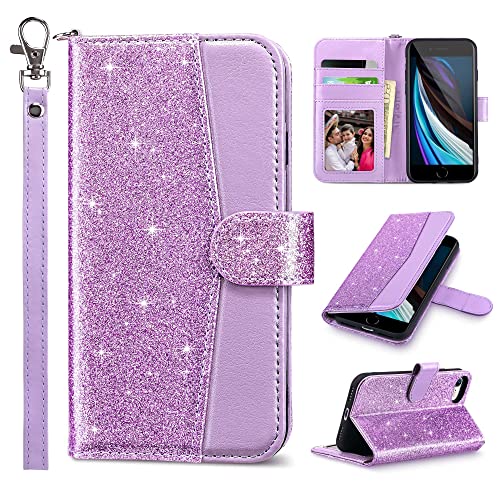 ULAK iPhone SE Case 2022/2020, iPhone 8 Case, iPhone 7 Wallet Case, PU Leather Case with Card Holder Kickstand Shockproof Protective Flip Cover for iPhone 7/8/SE 2nd/3rd Gen 4.7 inch, Purple Glitter