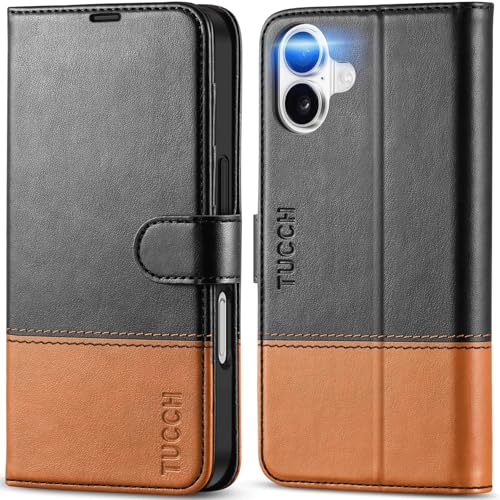 TUCCH Case for iPhone 16 (6.1") 2024, Protective Magnetic PU Leather Wallet Case Flip Cover with [RFID Blocking] [Card Holder] [Shockproof TPU] Compatible with iPhone 16 5G, Black & Brown