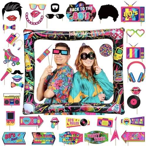 80-tal retro fest uppblåsbar fotobås med 40 st fotobås rekvisita selfie bildram för 1980-talets disco-fest, barnfest speltillbehör, gigantisk rekvisita ram firande uppblåsbar festrekvisita