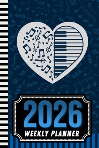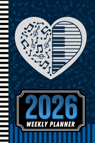 2026 Weekly Planner: Hardcover / 6x9 Dated Diary With To Do List - Habit Tracker - Notes Section / Agenda Gift / Piano Keyboard Heart Design on Blue Music Note Pattern