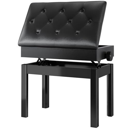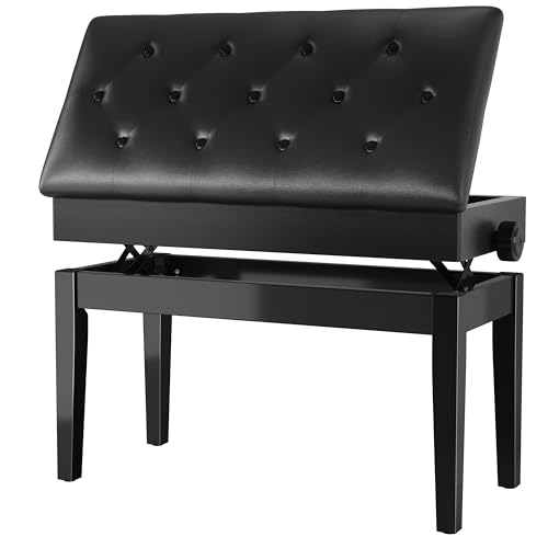 Höjdjusterbar pianopall 56 x 33 x 58 cm, pianosäte med förvaringsutrymme, pianobänk med PU-läderkudde, pianopall maximal belastning 150 kg, 4 st pianofötter, massivt trä, svart
