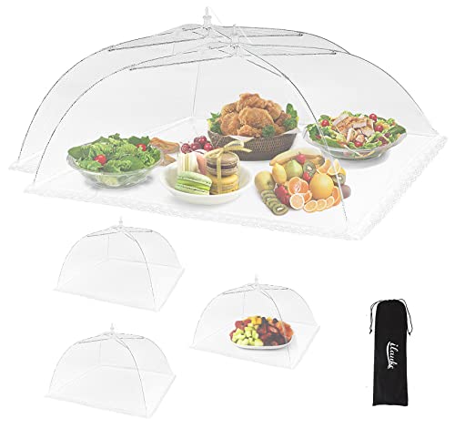 ilauke Set med 5 flughuvor, 2 stora vikbara flugkåpor (100 x 60 cm) och 3 standarder, vikbart tårtskydd för frukt, mat, grill, fest, buffé, picknick, camping med förvaringsväska, vit