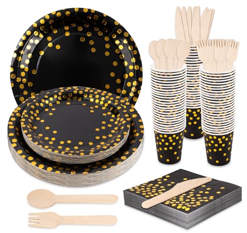 TOPWAYS Svart guld födelsedagsdekorationer fest servis set, engångspapper festtallrikar koppar servetter bordsduk för födelsedagsdekorationer bröllop picknick årsdag (16 gäster)