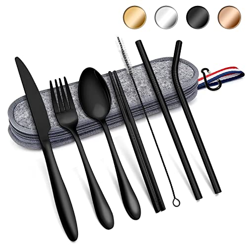 Herogo Resebestick-set, 8 stycken campingbestick av rostfritt stål, bärbara redskapsset med bärväska, kniv, gaffel, sked, ätpinnar, sugrör, borste för utomhusbruk, resa, picknick (svart)
