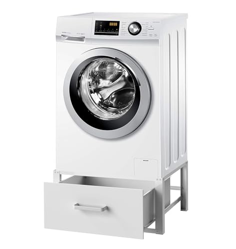 ML-Design Robust Tvättmaskinsbasram med Utdragbar Låda 63x54 cm i Vit Stål Max Belastning 150 kg Stabil Tvättmaskinsunderrede Piedestal 31,5 cm Förhöjning Underkonstruktion för Torktumlare Kylskåp