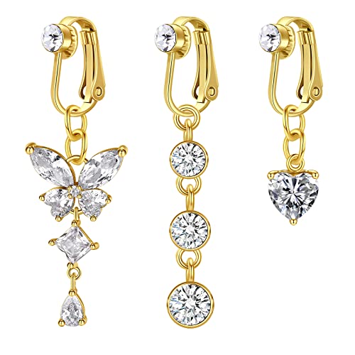 D.Bella Falsk Magpiercing Klämma på Navelring i Kirurgiskt Stål - Örhängen med Diamant, Fjäril, Hjärta - Icke-Piercing Smycken i Guld, Rostfritt