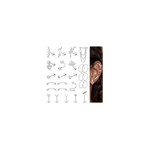 JeweBella 20 st örhängen dam kirurgiskt stål piercing öron silver guld hjärta stjärna måne fjäril orm örhängen set piercing helix tragus conch daith, Rostfritt stål