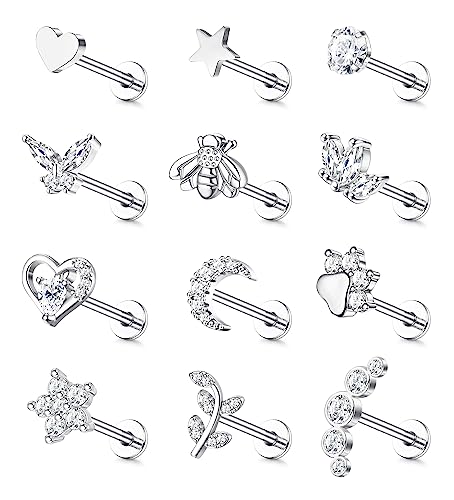 JewBella 12 stycken 16 g brosk helix örhängen för kvinnor män kirurgiskt stål inre gänga CZ måne hjärta stjärna blad lab monroe medusa näsbult conch tragus helix piercing silver/guld, 16er Ringgröße