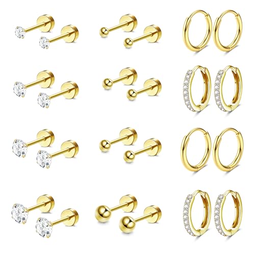 Diamday Örhängen, 12 par guldfärgat set för kvinnor, av kirurgiskt stål, kreolska örhängen, piercing för öra, helix och brosk, medicinska örhängen, huggie-kreoler, allergivänliga gyllene örhängen,
