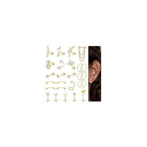FIOROYAL 27 st Helix Piercing Örhängen Hypoallergena Kirurgiska Stålörhängen För Kvinnor Män Små Cz Platta ryggörhängen Brosk Helix Hoop Kedjepiercing Tragus Örhänge Piercing Smycken a