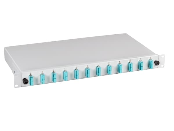 FO patchpanel med utrustning 19'' 1U, 24x SC APC dx, OS2, pigtails, adaptrar, brickor, grå